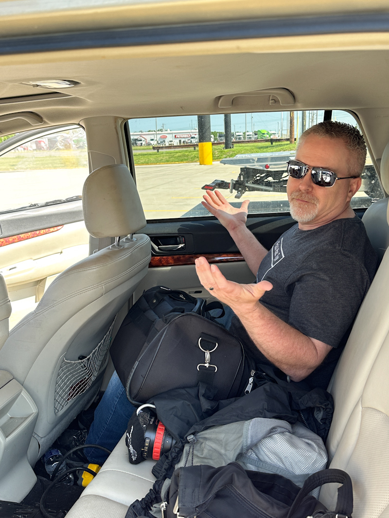 Sean Casey’s camera, a Red that shoots IMAX resolution video, and with all the lenses and attachments, might be worth about as much as the car. Sean wanted to ride in the backseat so he could film with the side windows down, as the polycarbonate front windows were affixed in place and couldn’t be lowered.