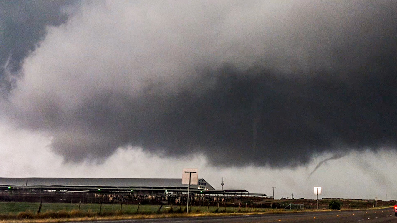 We made it to the north paved road as a tornado condensed yet again. We were unsure at this point about whether these funnels were separate tornado cycles or part of the same intermittently visible tornado.