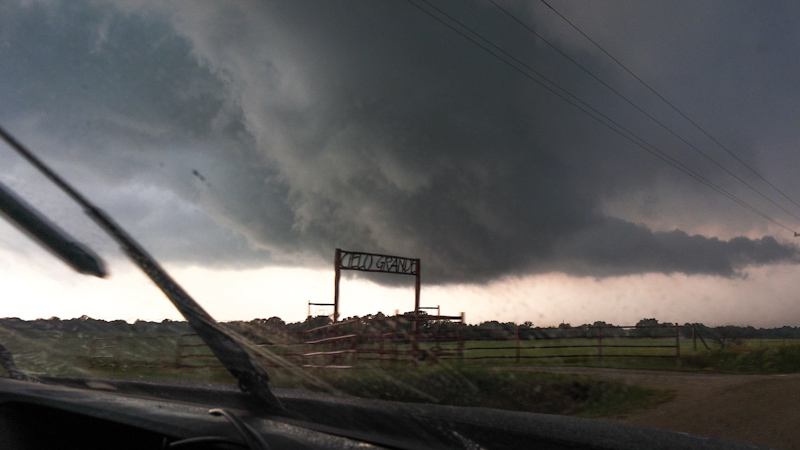 We made Chuck our designated driver for the chase, I would ride shotgun doing our data and navigation, and Carrie was in the back with Sean, getting some interior action shots along the way. Storms fired in a roughly west to east line south of Wichita Falls and we scooted south of Windthorst, TX to intercept the lead, dominant cell. It hid in the hazy murk of the moisture rich air over a road hole where we couldn’t get close. The cell was still maturing so rather than screw around on backroads, we elected to go back the long way around and get in front of it near Windthorst. Chuck got to prove his driving skills, executing a fast turnaround on an unpaved road and then negotiating some hail and chaser traffic as we threaded our way back in front of the storm. Meanwhile, the cap was eating storms. One by one, the trailing cells to the west were choking and dying, perhaps due to warmer temps aloft and lingering inhibition. Despite CAPE in excess of 5,000 J/kg, our cell looked like it was starting to buckle as well. But it hung in there, and then steadily started to ramp up again, picking up a tornado warning as we made the left turn northward to get ahead of it.