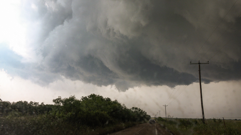 A paved east option wasn’t for a few miles, and it was going to be a bit of a race getting to the intersection before the rear flank and potentially tornadic part of the storm did. Carrie, Sean, and I carefully scanned up and down the large bowing base as our path and the storm’s converged. Fortunately, Chuck remained focused on the road ahead. A line was down, draped across the road like a perfectly poised storm chaser trap. Chuck swerved right for a gap as the rest of us could only react in alarm at the last moment. The car made it underneath the wire, which rolled up and over the windshield. I was terrified it was going to catch the hail guard and act like the arrestor cable of an aircraft carrier, bringing us to an instant stop. The wire did not catch and we made it past unscathed. “We were lucky,” Sean said as the rest of us breathed a sigh of relief. We weren’t under the base of the storm yet, and appeared to still be in the clear air inflow to the east, so I was not anticipating debris and storm damage road hazards. It was a stark reminder that chasers need to always be vigilant.