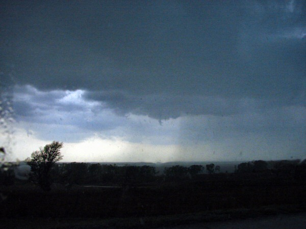 | Mike and Adam were driving right behind me. Brandon called to alert me of a funnel cloud. I thought he was talking about the scud condensing on the north end of the base. Instead there was a small but well defined funnel in the middle of the base. I admit I was fixating on the other feature and missed actually spotting it, but I did manage to snag it in my photos I shot of the base. |