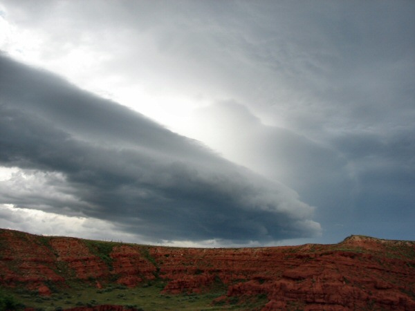 | The storm's gust front over some red clay hills: |
