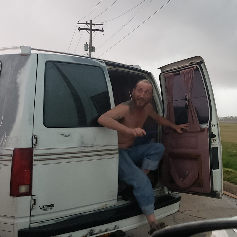 As I was taking pictures of that, I realized there was someone in the van next to me. A shirtless man climbed out of the back.