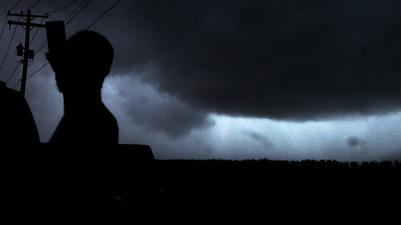 He started taking pictures of the storm with his phone, and unfortunately walked right in the way of my dashcam right when the area of interest started to look a lot more funnel like.