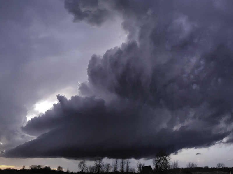 In the twilight, I was greeted by a small but dramatic cell sporting supercell structure with a laminar bell shaped base, and twisting updraft with billowing convection.