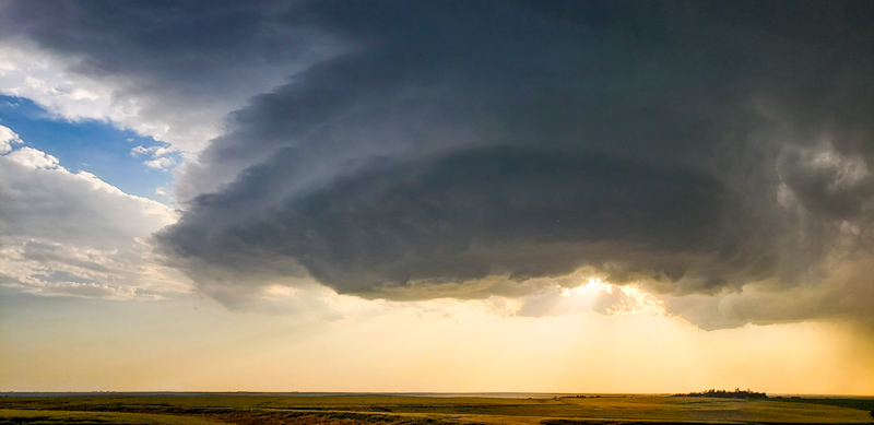 There was a little side road off the main south highway out of town that offered a great view of the developing storm, and it was soon lined with storm chasers. We watched for awhile with spitting rain and small until the forward flank finally moved off of us, so I set the DSLR up on a tripod for a time lapse. Meanwhile, the storm was splitting. The right split transitioned from a classic supercell into a Low Precipitation type as it withered away, but it put on an amazing sunset show in the process.