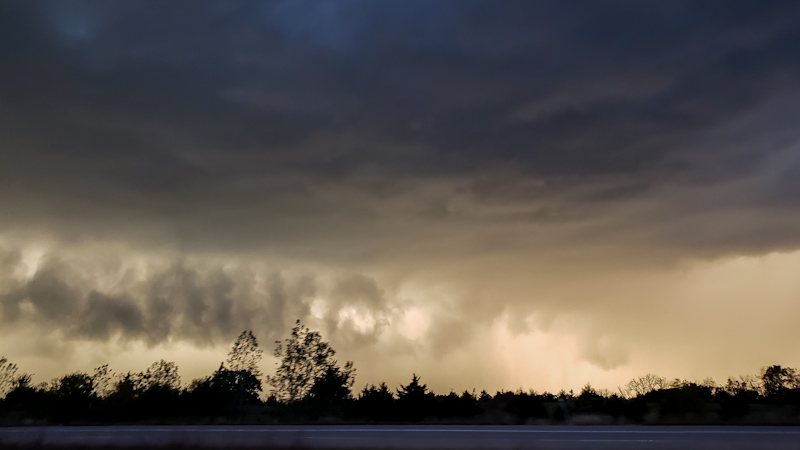 I blasted east with a handful of other chasers, hoping to stair step and meet the storm again up in Kingdom City where it would hopefully cycle in the better backed winds to the northeast and maybe clean out its rainy RFD. Radar trends made it appear that the storm was instead gusting out, however. I eventually ended the race and turned around to catch the next cell in the line. It was smaller and unwarned, but it had a nice shape and tiny couplet on the radar, and it would conveniently cross the highway I was already on. A gust front illuminated in golden sunset colors emerged. It was pretty but didn't do much in the way of rotation.